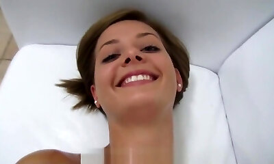 Lucky guy talked a brunette ultra-cutie into playing with his jizz-shotgun