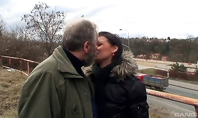 Gorgeous Czech porn industry star gets fucked by a crazy old chap outdoors