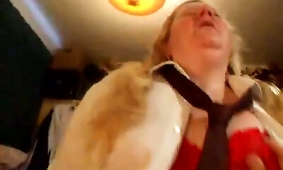 Extremely fat and horny mature slut with ugly flabby belly was riding pink cigar