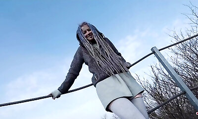 Longpussy, out for a walk, Huge Pussy Cork, Sheer Top, High Heels, Hip Highs and a Brief Skirt in Public!